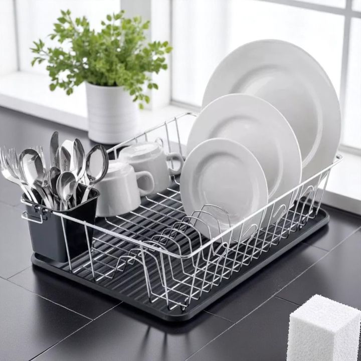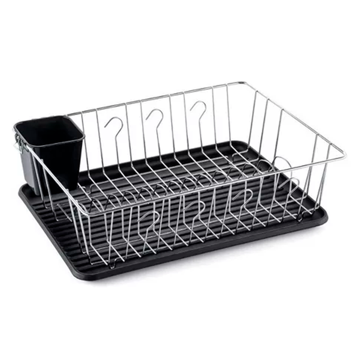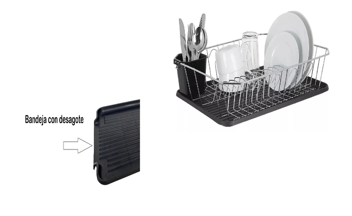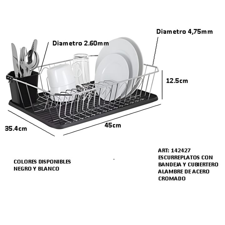 HOGAR ACTUAL ESCURREPLATOS CROMADO C/BANDEJA SKU: 142427 Articulo 142427 Características -Viene con bandeja con desagote y cubiertero de PP. -Para apoyar en mesada. -Material: alambre de acero cromado. -Grosor del alambre: 4.68 mm de diámetro en el borde superior y 2.60 mm en el resto del producto. ...