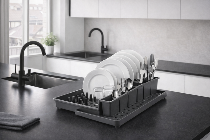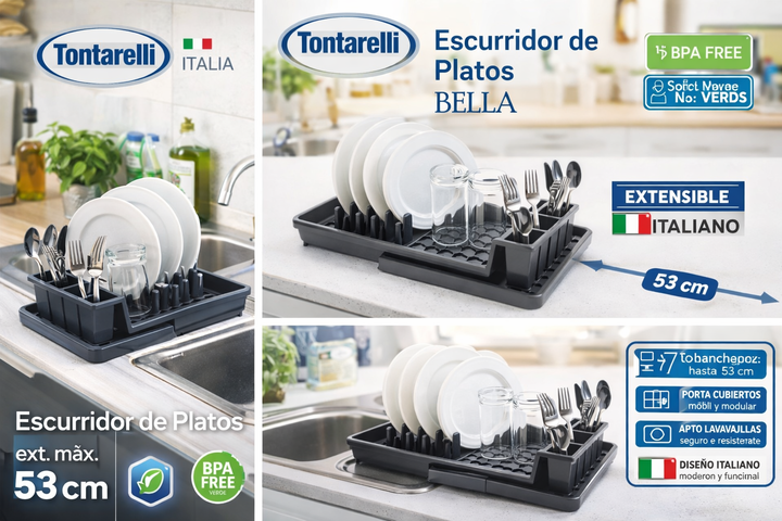 Escurridor de platos Tontarelli modelo BELLA, diseñado para un secado eficiente y organizado de vajilla y cubiertos. Fabricado en plástico (PP reciclable) resistente de alta calidad, combina funcionalidad y diseño moderno, ideal para cocinas contemporáneas. Cuenta con porta cubiertos móvil y modular...