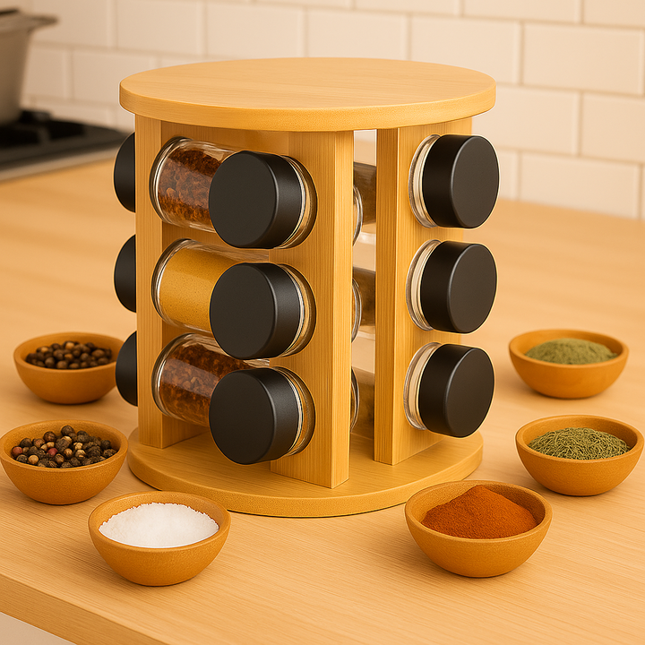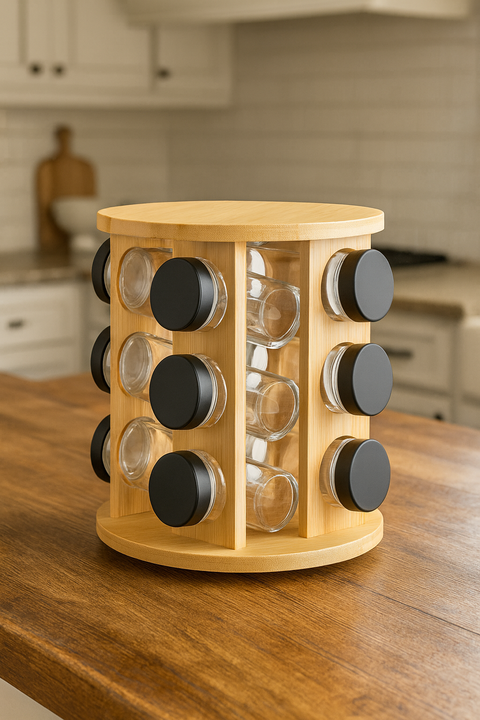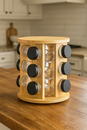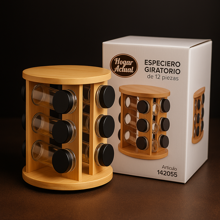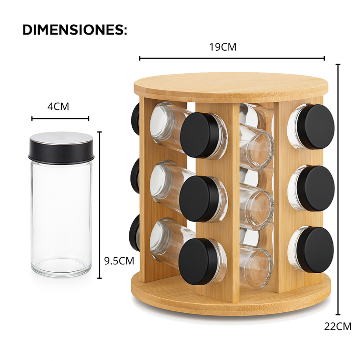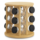 HOGAR ACTUAL ESPECIERO DE BAMBOO DE 12 FRASCOS CON TAPAS DE COLOR NEGRO SKU: 142055 -Contiene 12 especieros de Vidrio con tapa plástica negra -Soporte de bambú -Giratorio -Presentación: caja color con foto -Capacidad Frascos: 110 ml -Medidas : alto 22cm ancho 19cm