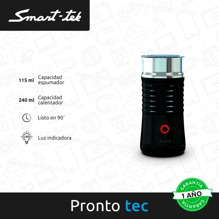 CARACTERÍSTICAS: - Marca: Smart-tek - Modelo: MF850 - Capacidad espumador: 115 ml - Capacidad calentador: 240 ml - Botón de encendido: Si - Luz indicadora: Si - Interior: Teflonado - Fácil limpieza: Si - Base antideslizante: Si - Base 360º: Si - Dimensiones (AnxAlxPr): 14 x 19 x 12 cm CONTENIDO DE L...