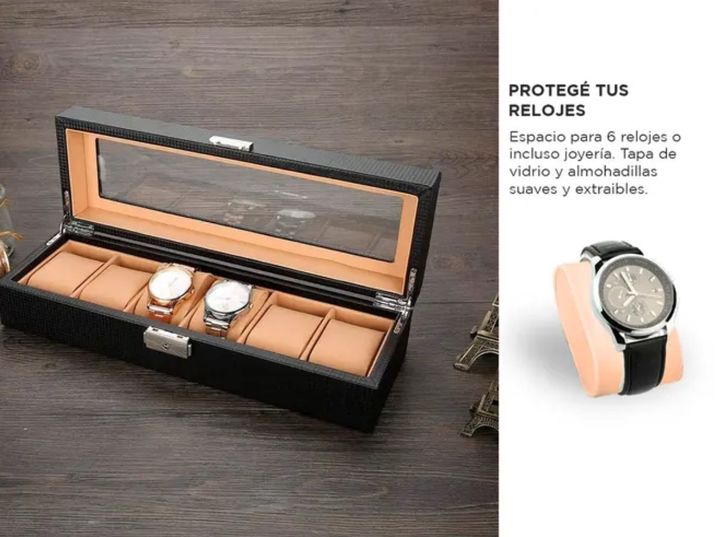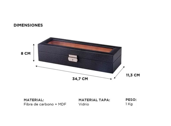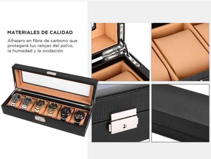 ¡Nuevo Alhajero Moderno Gadnic! Alhajero en fibra de carbono, ideal para el almacenamiento de relojes, joyas, pulseras y collares. Perfecto para el hogar o como idea de regalo. Posee una tapa superior con ventana de visualización de vidrio y almohadillas para relojes extraíbles e independientes. Tie...