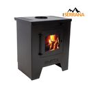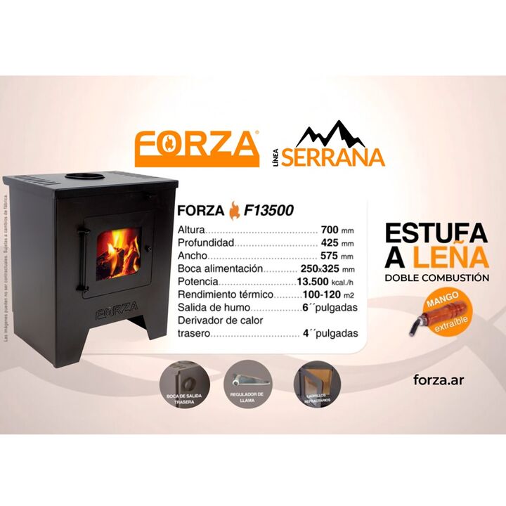 Nueva estufa linea serrana. Rendimiento de 100 a 120 mts2. Altura: 700 mm Profundidad: 425 mm Ancho: 575 mm Boca de Alimentación: 250 x 325 mm Interior de ladrillos refractarios. Regulador de llama. Boca de salida trasera 4. Salida de humo 6.