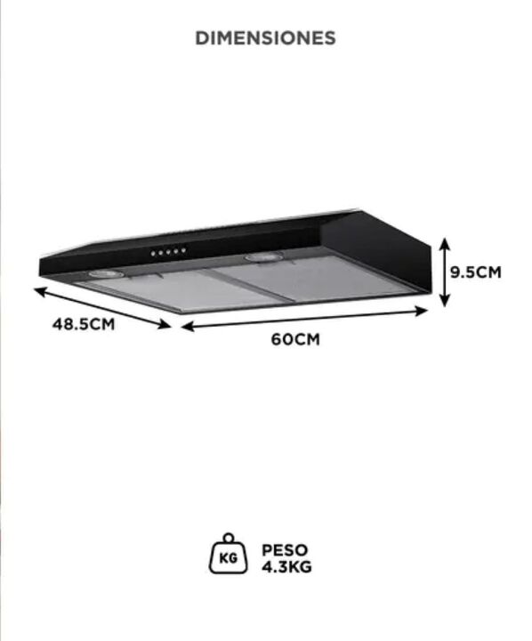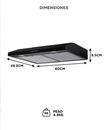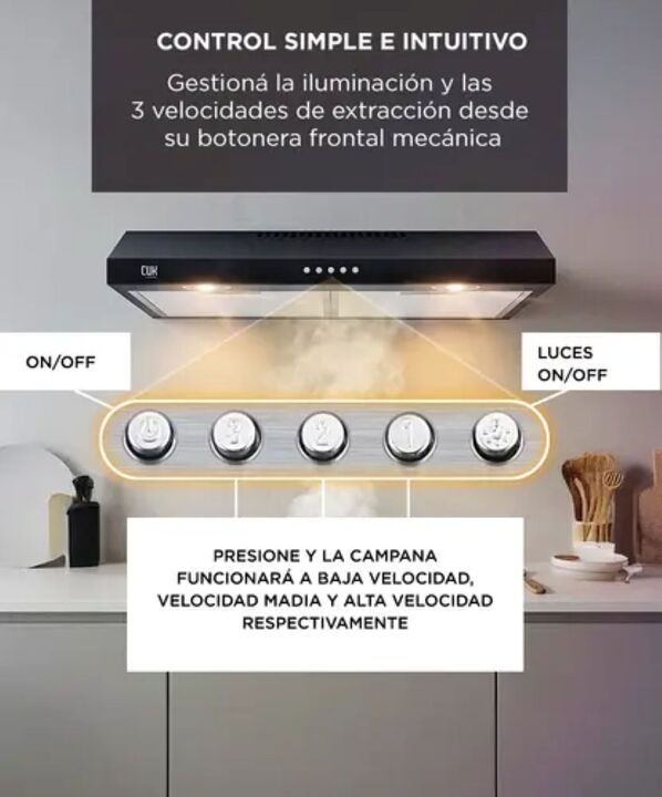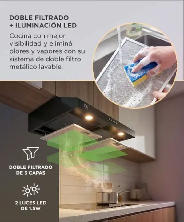 Potencia real de extracción 250 m³/h: El extractor CUK by Gadnic EXT11971 elimina humo, grasa y olores con flujo de aire de 250 m³/h, ideal para cocinas domésticas medianas. Doble sistema de filtrado eficiente: Incluye 2 filtros de aluminio de 3 capas lavables y filtro de carbón para uso con o sin s...