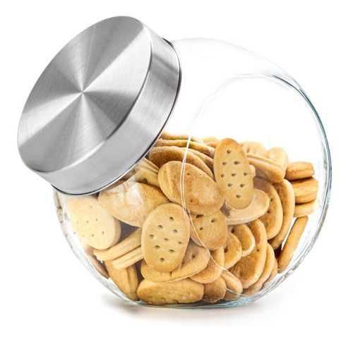 Frasco redondo de vidrio con tapa de acero a rosca. Con 2 posiciones de apoyo. Medidas: 13 cm. ancho x 17 cm. de alto x 12,5 cm. de profundidad Ancho de la boca: 9,5 cms Capacidad en litros : 2,100 lts Ideal para galletitas, caramelos, nueces, almendras, caramelos, etc En caja de regalo.
