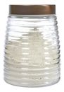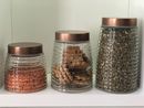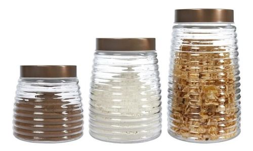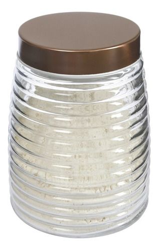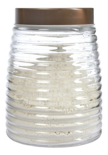 Frasco de vidrio con tapa de cobre a rosca Mediano Medidas : Altura Total : 16,5 CMS Capacidad : 1200 cc Diametro : 12,5 CMS Tapa de acero a rosca que asegura un optimo guardado con buen cierre y hermeticidad. Ideal para el guardado de : azúcar, nueces, almendras, arroz, galletitas, cereales ... e...