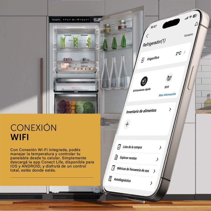 Descubrí el Freezer Panelable WIFI Inverter No Frost 230 litros de Vondom. Este freezer se integra con los muebles de tu cocina, preservando el diseño de tu espacio. Su conectividad WIFI, permite programar a distancia, revisar el ahorro energético y recibir notificaciones directamente en el teléfono...