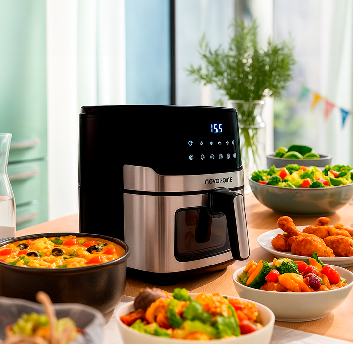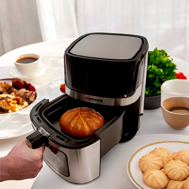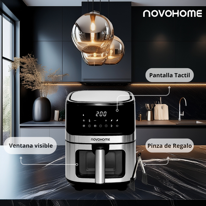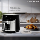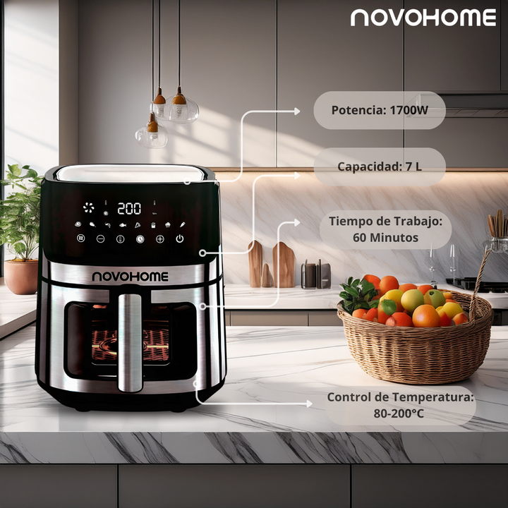 NOVOHOME AIRFRYER 7 LTS 1700W SKU: NH-AF 70WIX TEXTURA CRISPY, SIN ACEITE Tecnología Fry Force 360°: Cocina los alimentos de forma rápida y uniforme con poco o nada de aceite. Los alimentos quedan crujientes por fuera y jugosos por dentro mientras que se utiliza un 80% menos de grasa. Pantalla fácil...