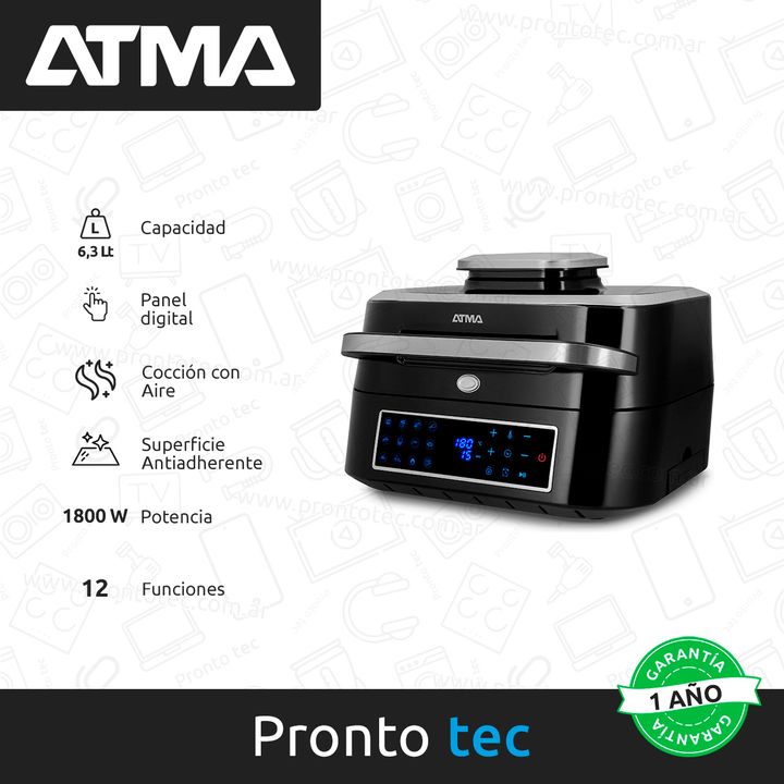 CARACTERÍSTICAS: - Marca: Atma - Modelo: 94FR901DP - Capacidad: 6,3 Lt - Temperatura: 50 a 260 °C - Display: Digital - Pantalla: LED - Potencia: 1800 W - Funciones: 12 - Timer: Si - Alarma sonora: Si - Dimensiones (AnxAlxPr): 36,5 x 38,5 x 29,5 cm - Peso: 8 Kg CONTENIDO DE LA CAJA: - Bandeja y termó...