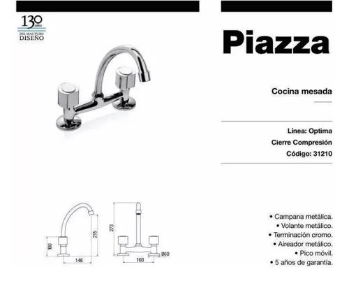 GRIFERÍA DE COCINA PIAZZA MESADA LINEA OPTIMA CROMO 31210 Disfruta de la elegancia y funcionalidad de la Grifería Cocina Canilla Mesada Optima Cromo de Piazza. Esta grifería de cocina de doble comando te permite controlar la temperatura del agua con precisión, facilitando tus tareas diarias en la co...