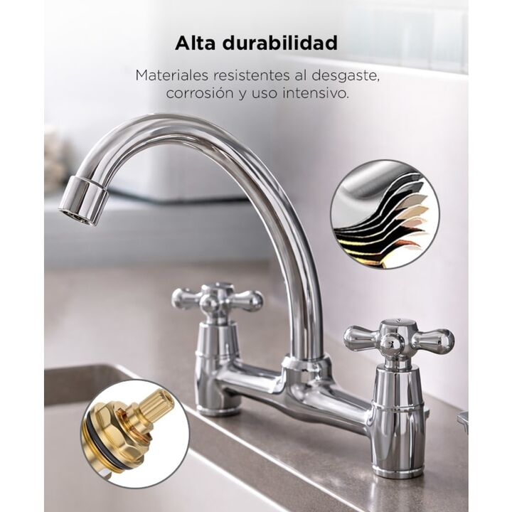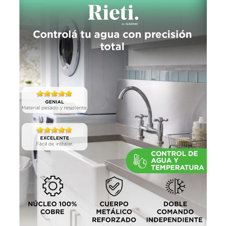Durabilidad superior con núcleo completo de cobre: La grifería doble comando Rieti by Gadnic incorpora cartucho interno de cobre macizo que garantiza un cierre firme y mayor vida útil. Reduce desgaste prematuro y evita filtraciones. Cuerpo metálico con acabado cromado resistente: Fabricada en aleaci...