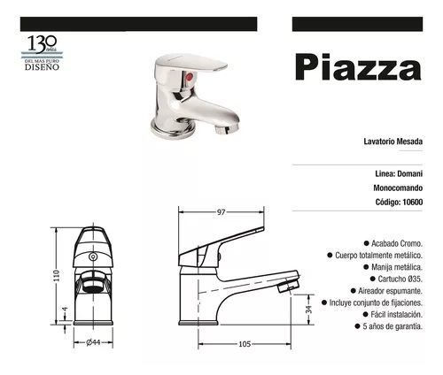 GRIFERIA MONOCOMANDO LAVATORIO PIAZZA DOMANI BAÑO 10600 En tus actividades del día a día usá productos resistentes y funcionales. La grifería de baño Piazza 10600 está diseñada para adaptarse a cualquier espacio con personalidad y desarrollar con eficacia tareas como el lavado y la limpieza. Al esta...