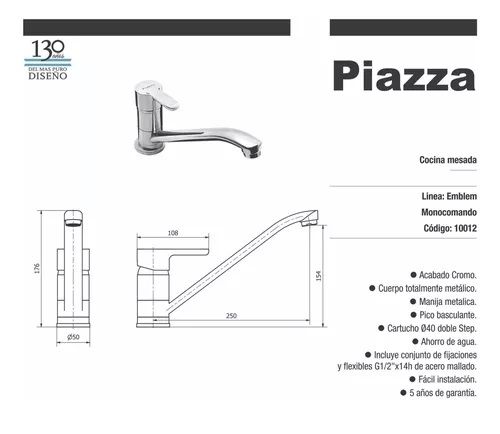 GRIFO COCINA MONOCOMANDO PIAZZA EMBLEM 10012 ACABADO CROMADO EMBLEM 10012 Esta grifería permitirá completar tu cocina brindándote mayor comodidad gracias a su pico móvil a 360°. Además gracias a su sistema de cierre cerámico Doble Step podrás regular el consumo de agua en tu hogar con mayor facilida...