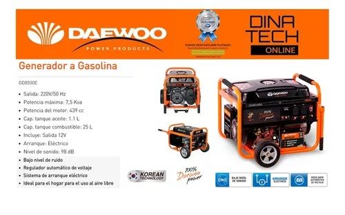 GRUPO ELECTROGENO DAEWOO GD8500E 7500W ARRANQUE ELECTRICO GD8500E Daewoo GD8500E es una de las herramientas más útiles para realizar tus actividades sin preocuparte por los cortes de suministro. Además, es compacto, ocupa poco espacio y es fácil de usar. PODEROSA TECNOLOGÍA Este modelo cuenta con te...