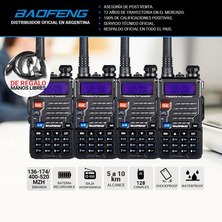 El Handy Baofeng UV-5RE Kit x4 Bi-Banda es ideal para quienes buscan una comunicación fiable y de largo alcance. Con una potencia de 5W y capacidad para operar en bi-banda (VHF/UHF) en 128 canales, este kit permite mantener comunicación efectiva en distancias de hasta 10 km, ideal para actividades a...