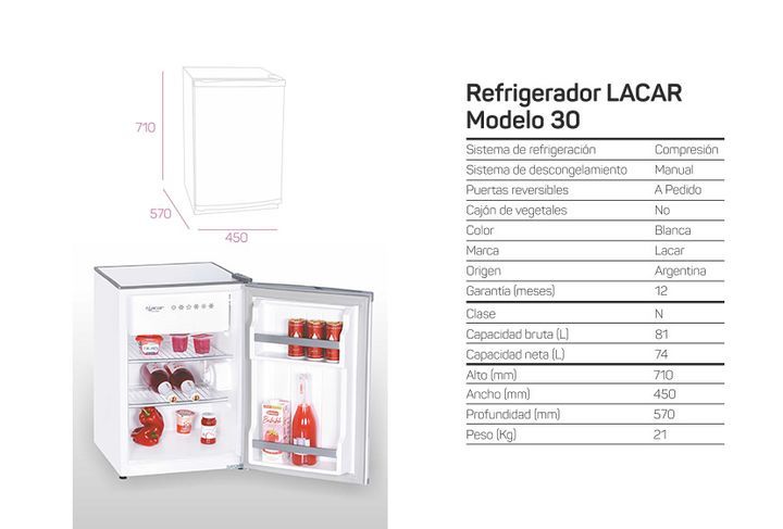 Caracteristicas tecnicas . Refrigerador . Estantes regulables s . Material de estantes rejilla . Capacidad . Capacidad bruta 81 lt . Caracteristicas generales . Control de temperatura manual . Color blanco . Eficiencia energetica b . Dimensiones . Alto 705 cm . Ancho 45 cm . Profundidad 55 cm