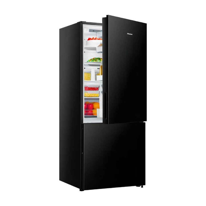 Disfrutá la Heladera No Frost Hisense 417L negra, diseño moderno, freezer inferior y eficiencia A+. Conservá tus alimentos frescos y organizados. ¡Comprala ahora!