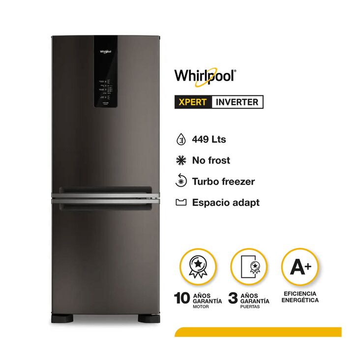 Heladera No Frost Whirlpool WRE57CE Xpert Inverter 449 Lt: Eficiencia A+, Freezer Inferior y Diseño NegroSi estás buscando una heladera que combine diseño, gran capacidad y la tecnología más avanzada en ahorro, la Heladera No Frost Whirlpool WRE57CE Xpert Inverter es tu mejor opción. Con una capacid...
