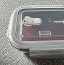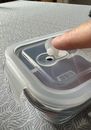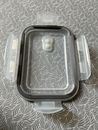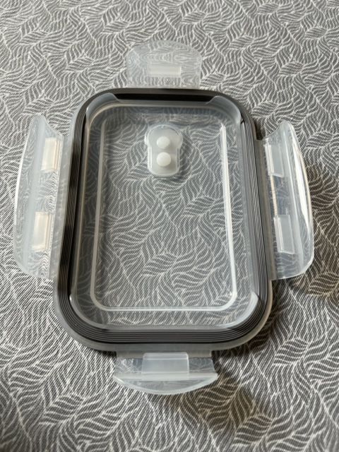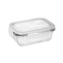 Hermetico Contenedor Taper de Vidrio con tapa Plastica y Goma Medidas internas de la base : 12,5 x 8,5 x 4,5 ( altura) cms Capacidad : 400 ml Medida mas pequeña Base : vidrio resistente , grueso Tapa : Plastico con agarre en cada lado y goma que asegura hermeticidad y buen cierre. La tapa tiene en s...