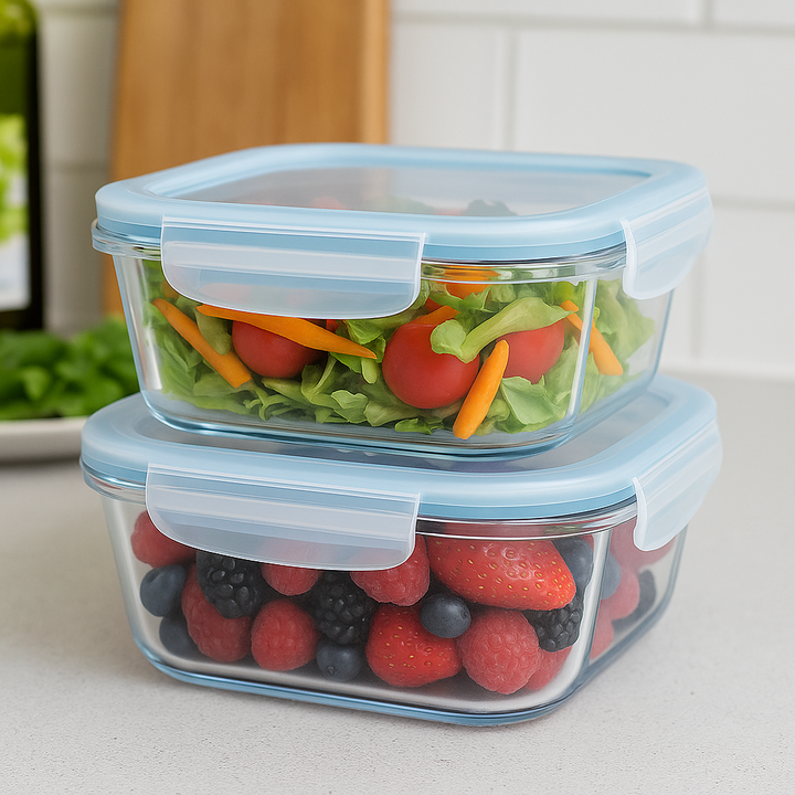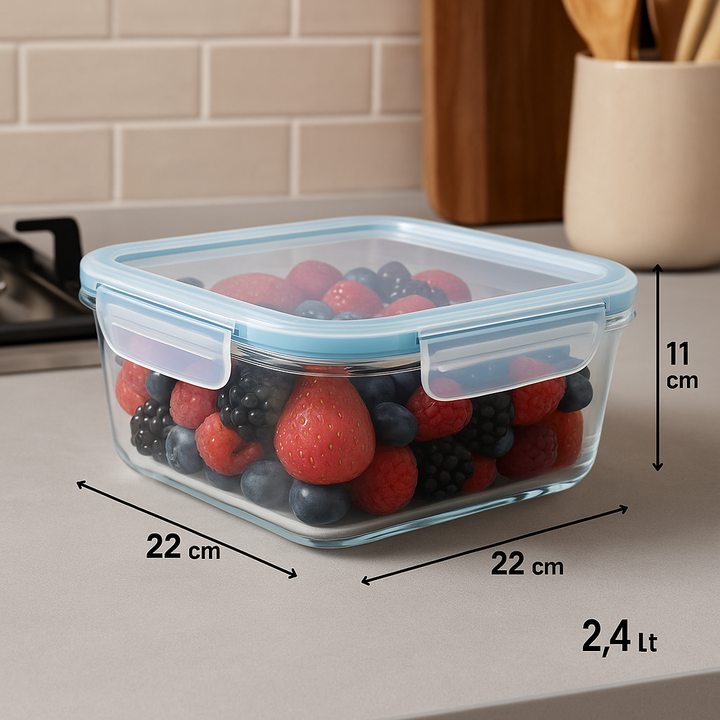 Hermetico Contenedor Taper de Vidrio con tapa Plastica con Goma y Cierre Clip en cada uno de sus lados. Es cuadrado grande de 2,4 lts. Medidas : Medidas externas : 22 x 22 x 11 cm Medidas internas de la base : 18 x 18 x 9 cms. Capacidad : 2,4 Litros Horno : hasta 300 grados ( solo la base ( no la ta...