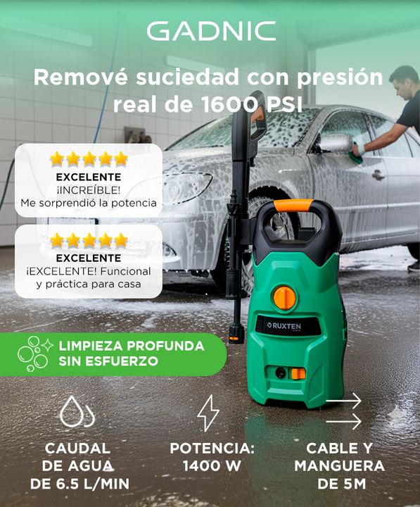 Descubrí la solución ideal para todas tus tareas de limpieza con la Hidrolavadora Gadnic. Con una presión máxima de 110 Bar (1600 PSI) y un flujo optimizado de agua, esta herramienta compacta y ligera elimina la suciedad más difícil en minutos. Equipada con un motor duradero, accesorios prácticos y ...