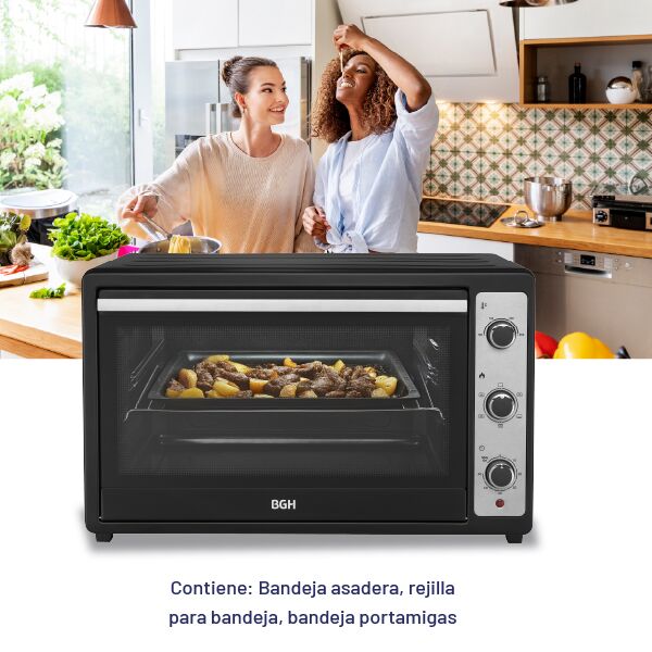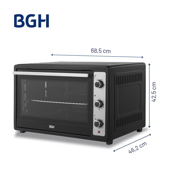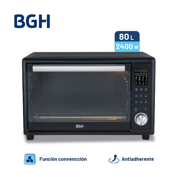 Horno Eléctrico BGH 80 Litros Mecánico Capacidad de 80 litros ideal para cocinar grandes porciones. Panel mecánico con timer de hasta 60 minutos y función “Stay On”. Función grill y convección para resultados más crocantes y parejos. Luz interior para controlar la cocción sin abrir el horno. Rango d...