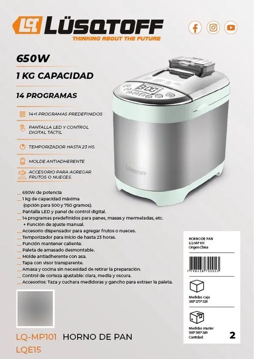 El Horno Panadero es la solución perfecta para quienes desean disfrutar del pan casero fresco y delicioso en la comodidad de su hogar. Con una potencia de 650W y capacidad para elaborar panes de hasta 1 kg, se adapta a las necesidades de cualquier amante del pan, desde principiantes hasta panaderos ...