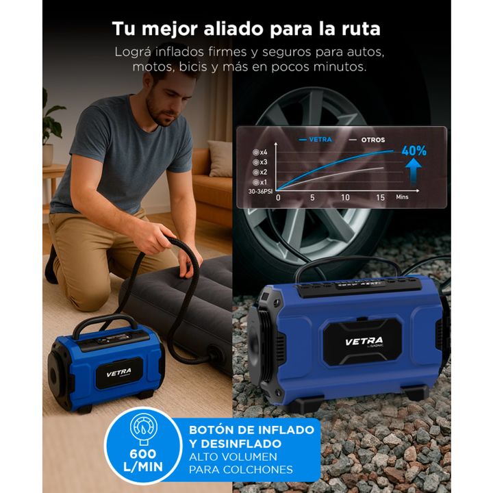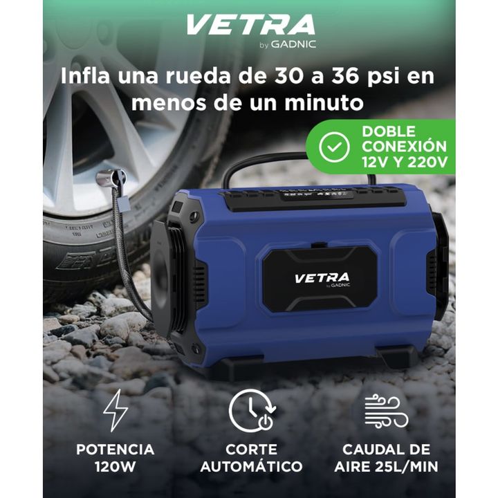 Potencia y precisión en cualquier situación El inflador portátil Vetra by Gadnic de ciento cincuenta PSI brinda la potencia necesaria para ajustar la presión de autos, motos, bicicletas y artículos deportivos. Su pantalla LCD permite seleccionar la presión deseada con exactitud y su apagado automáti...
