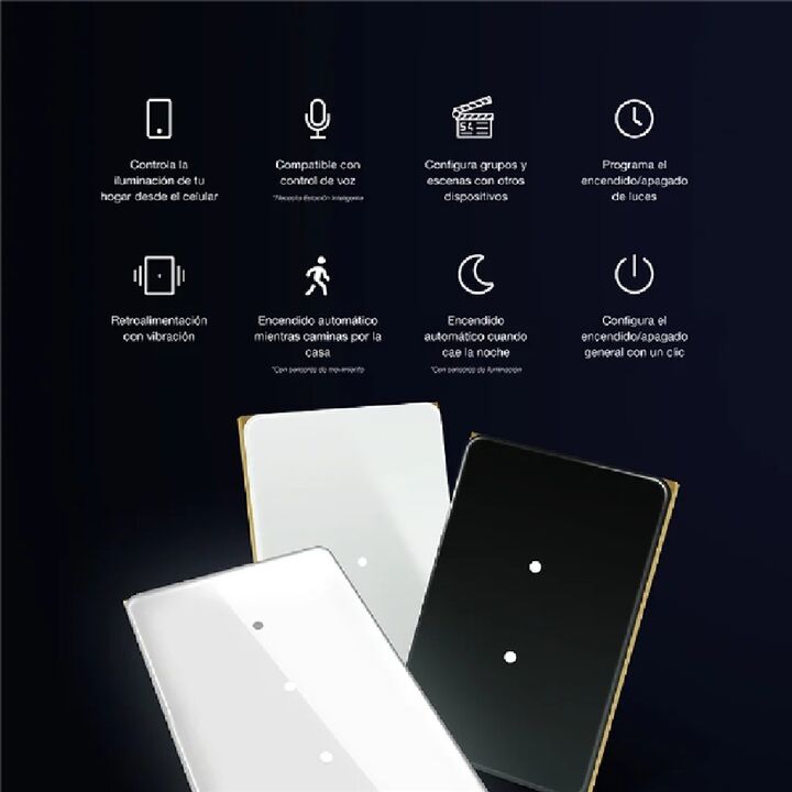 Interruptor inteligente con pantalla táctil 2.5D Controla las luces de tu hogar desde el celular o con tu asistente de voz favorito. El Interruptor Inteligente Moonstone cuenta con un panel de cristal 2.5D, que además resaltar por sus excelentes acabados y elegante diseño curvado en los bordes, prop...