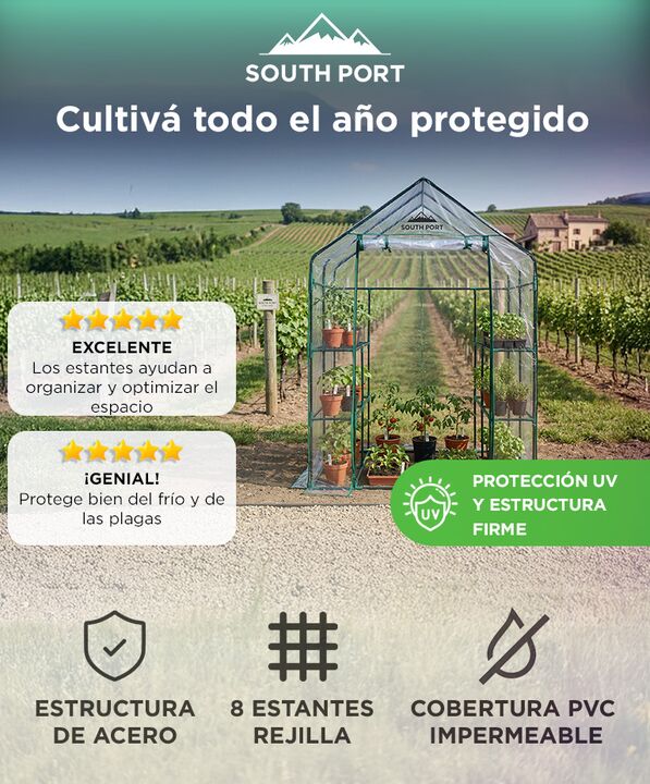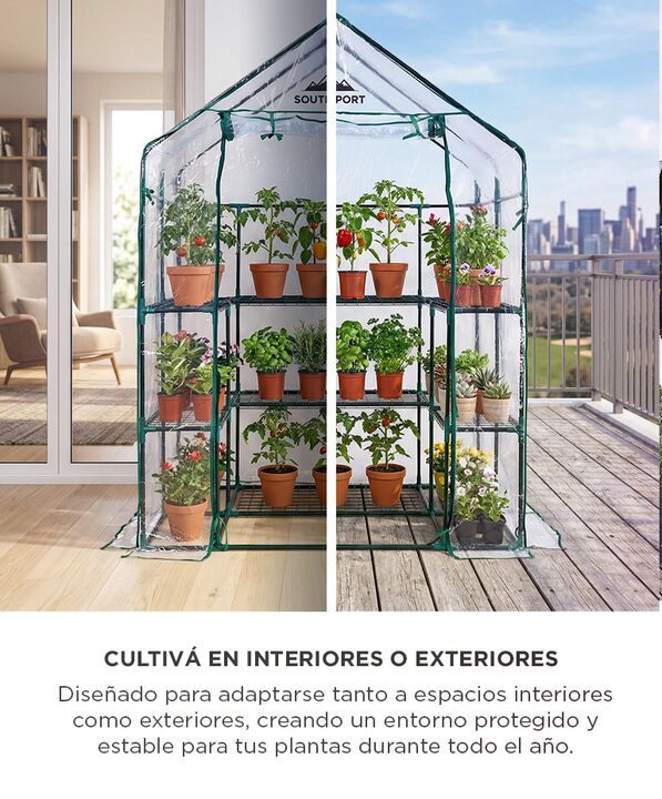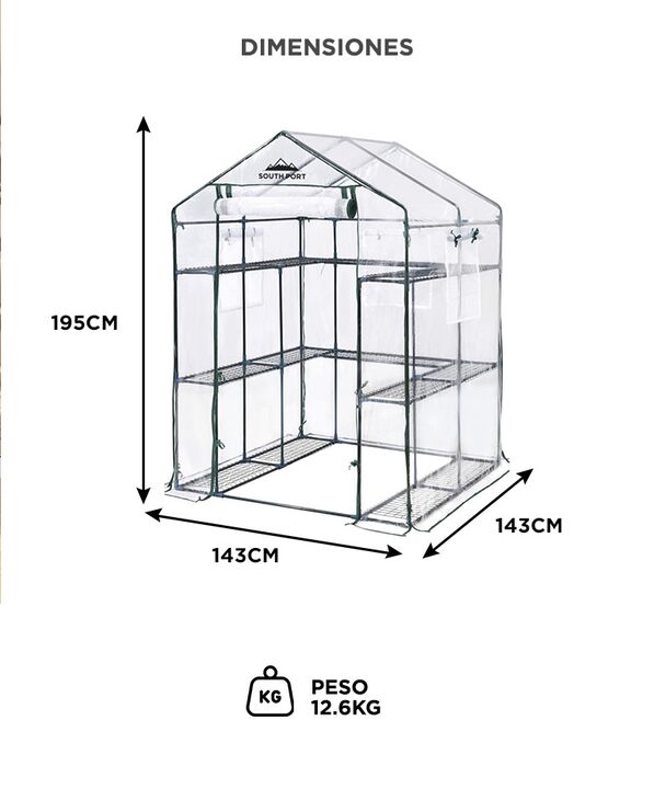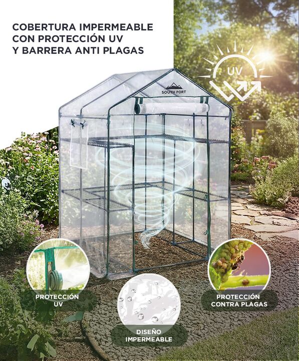 Estructura reforzada para mayor estabilidad: El Invernadero South Port by Gadnic INV04 cuenta con estructura metálica tubular y conectores firmes que brindan estabilidad superior frente a viento moderado. Ideal para uso exterior en patio o jardín. Diseño transitable con amplio espacio interior: Su f...