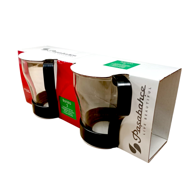 Set x 2 tazas de vidrio con asas y base de plastico negro resistente idela para bebidas calientes como cafe , te , mate , etc Asa y base plastico removible , ideal para lavar o usar el vaso. Medidas : Capacidad : 240 cc Medidas : Alto : 8,5 cms / Diametro superior : 7 cms / Diametro base : 6,5 cms A...