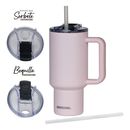 Capacidad: 900cc . Alto: 23cm. Diámetro base: 7,7cm. Doble pared aislante. Superficie antideslizante. Jarro con tapa hermética a rosca con manija de sistema desmontable. Apto bebidas frías