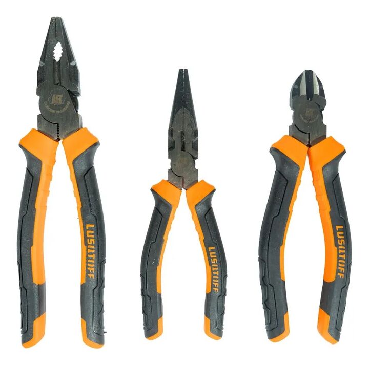 SET JUEGO DE 3 PINZAS CRV UNIVER ALIC PUNTA LUSQTOFF L4235 • Contiene 3 pinzas: Universal 8 (200 mm.) Alicate de corte diagonal 6 (150 mm.) Punta media caña 6 (150 mm.) • Línea Pro-50 CRV • Filo Xtra Sharp HCR-55-60 • Material del cuerpo: HRC-43-50 • Alto aplacamiento: 35% menos esfuerzo • Mango com...