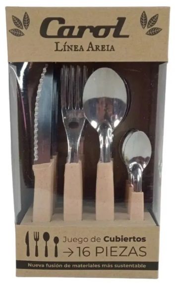Incluye 4 cuchillos hoja serrucho 4 tenedores 4 cucharas soperas 4 cucharas para te- BeneficiosAcero inoxidableExcelente calidad y resistenciaMango plasticoFusion de materiales mas sustentableCaja sustentableApto lavavajillas