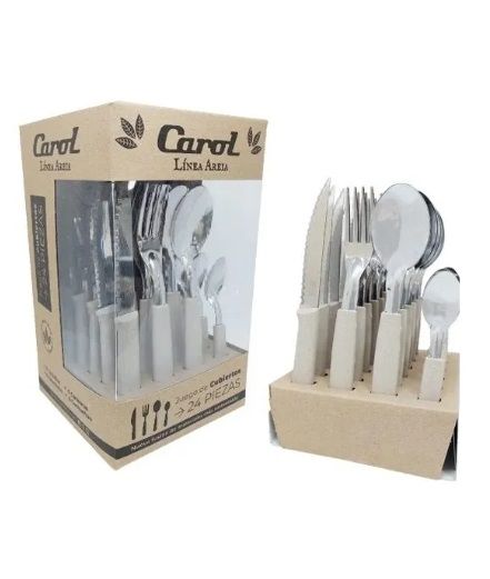 Incluye6 tenedores6 cuchillos6 cucharas6 cucharitasBeneficiosAcero inoxidableExcelente calidad y resistenciaMango plasticoFusion de materiales mas sustentableCaja sustentableApto lavavajillas