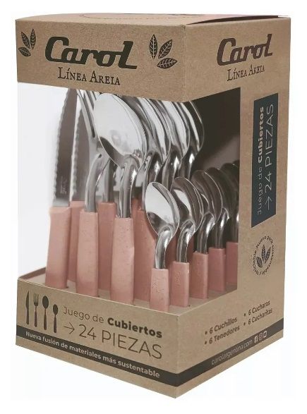 Incluye6 tenedores6 cuchillos6 cucharas6 cucharitasBeneficiosAcero inoxidableExcelente calidad y resistenciaMango plasticoFusion de materiales mas sustentableCaja sustentableApto lavavajillas