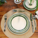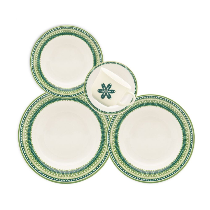 Del campo a la mesa. La colección Donna Campestre presenta una gama de elementos que caracterizan la apacible vida del campo, donde plantas, follaje y flores embellecen la vida cotidiana. La combinación de tonos verdes y diferentes formas representa la variedad de la flora brasileña.