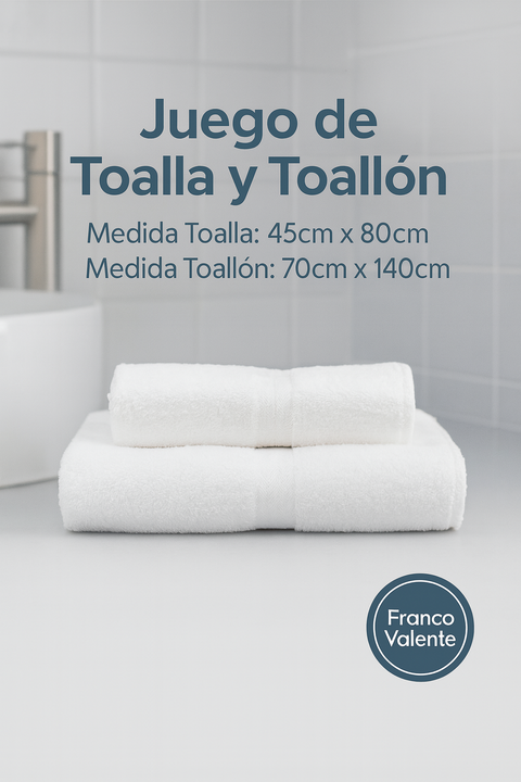 Set de Toallón y Toalla Franco Valente 400g Algodón - 100% algodón suave para una máxima suavidad - Materiales nobles y suaves - Proporciona al cuerpo un tacto suave y delicado mientras absorbe la humedad. - Mejor absorción de agua - Toalla: 45cm x 80cm - Toallón: 70cm x 140cm - Calidad gramaje: 400...