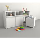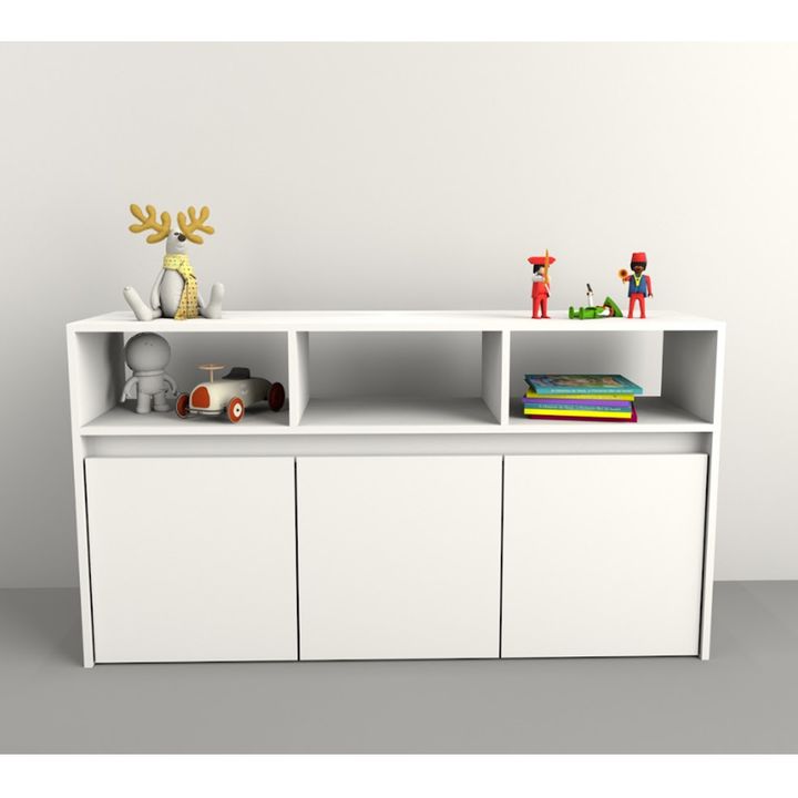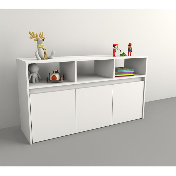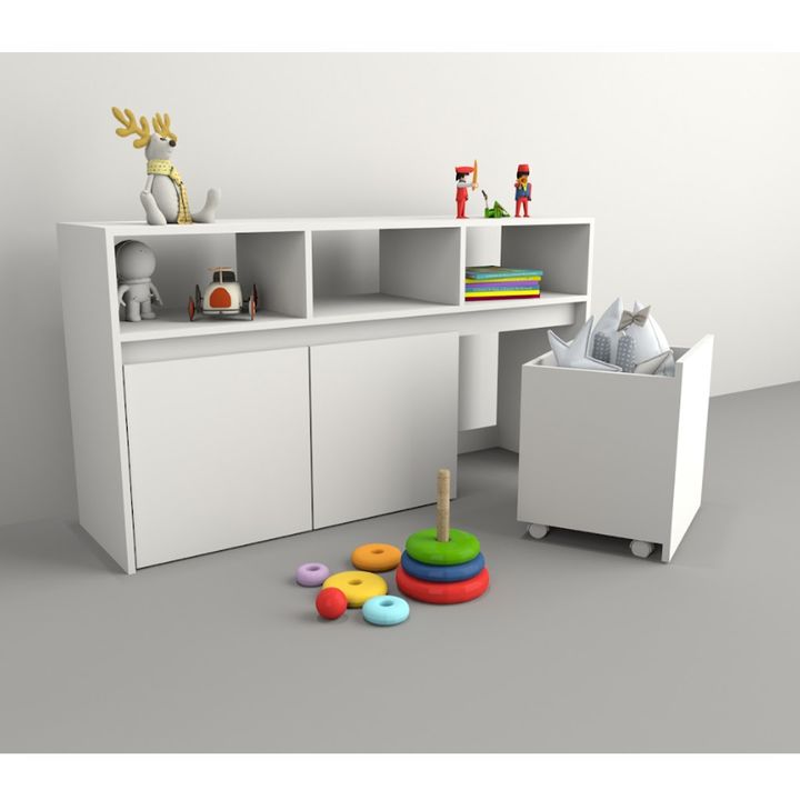 Módulo juguetero de melamina de alta resistencia. Tres cajones con ruedas individuales, lo que permite su completa extracción y traslado. Tres espacios superiores de guardado. Sistema Minifix. Color Blanco Medidas: Ancho: 1.27 mts. Alto: 0.70 mts. Profundidad: 0.36 mts.