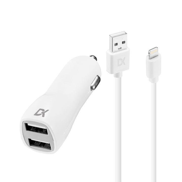 KIT CARGADOR AUTO+CABLE LIGHTING DEKKIN - Cable USB a Lightning - Potencia: 2 Amperes - Conectores: 2 puertos USB A - Carga y sincroniza datos