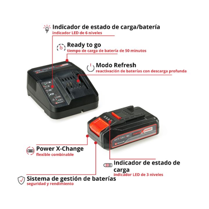 El Starter Kit Einhell PXC 18V 2,5 Ah es la base ideal tanto para empezar a trabajar con el surtido Power X-Change como para ampliarlo. El Starter Kit con una batería Power X-Change de 18V y 2,5 Ah y el cargador rápido forman parte del sistema de baterías Power X-Change de Einhell, que se puede comb...