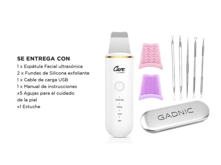 Especificaciones Espátula Facial Gadnic CL50 Ultrasónica - CLEAN005 Modos: 4 Modos Peso: 76 gr Potencia: 2W Frecuencia: 26000hz Voltaje de la batería: 3.7 V Mejora la elasticidad de la piel Carga USB Bajo nivel de ruido Capacidad de batería: 500 ma Mejora la textura y el tono de la piel Promueve la ...