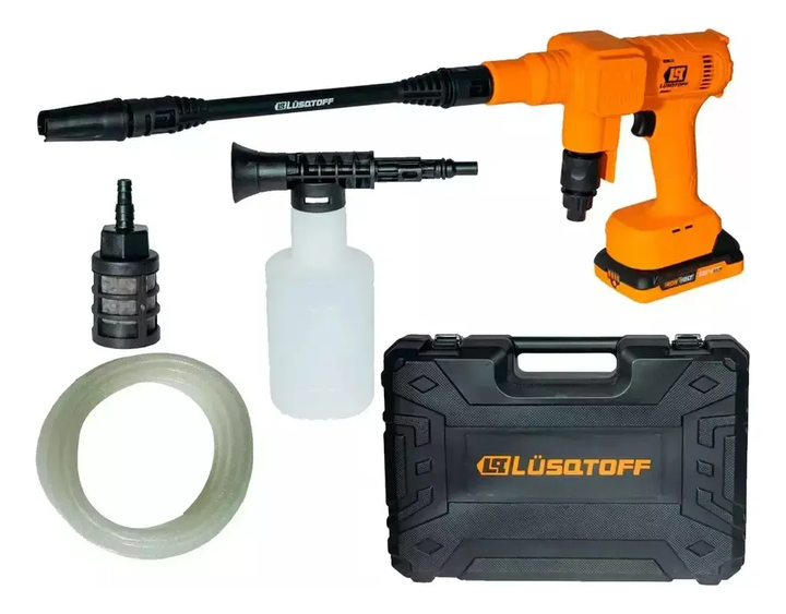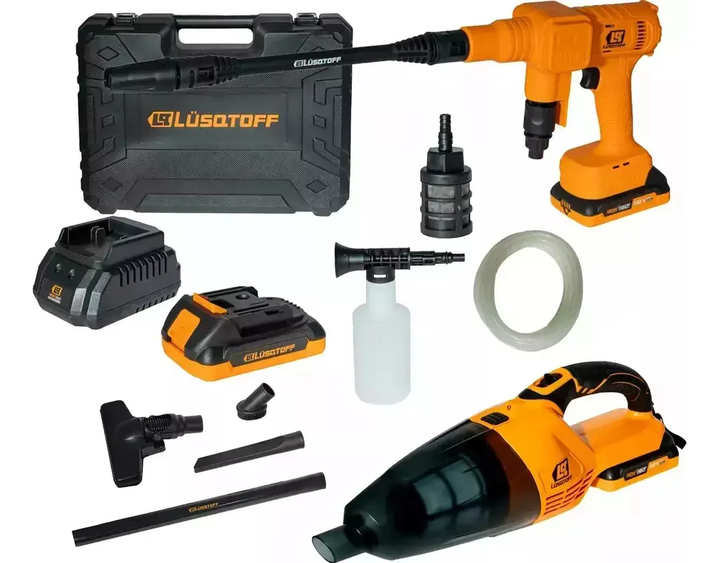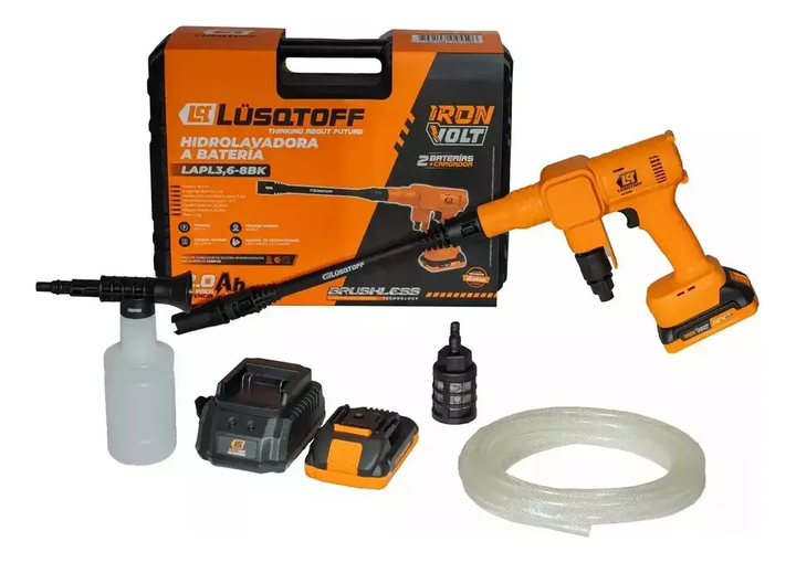 KIT HIDROLAVADORA + ASPIRADORA A BATERÍA LUSQTOFF KHAL-8BKR HIDROLAVADORA A BATERÍA LAPL3.6-8BK • Tensión: 18 V • Amperaje batería: 2 Ah • Tecnología Brushless • Presión máx. suministro agua: 5 bar • Temperatura máx. agua: 40°C • Caudal máximo: 3,6 l/min • Presión máxima: 30 bar • Peso: 4 kg INCLUYE...