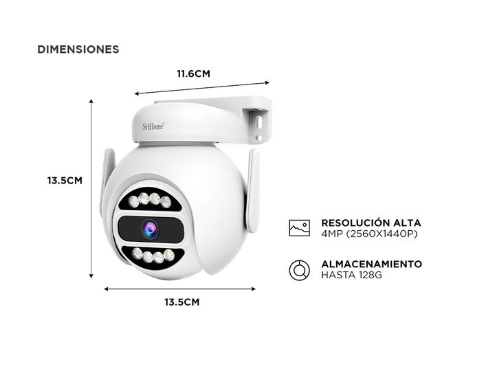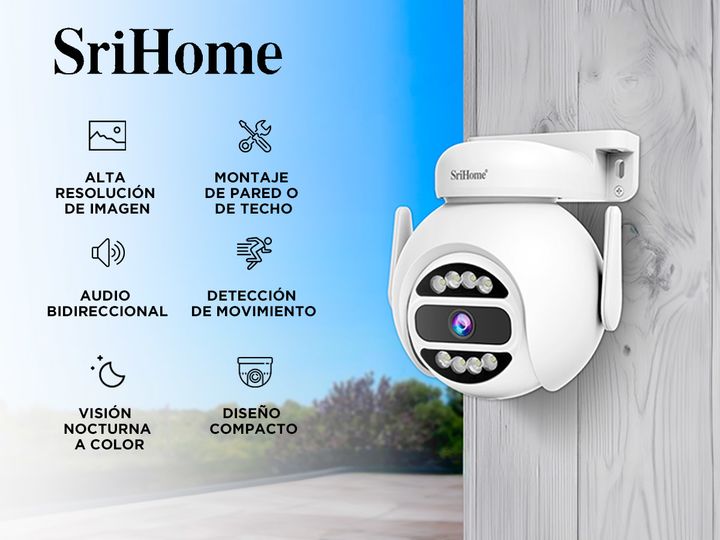 Especificaciones Cámara de Seguridad SriHome 4mp Audio De Pared o Techo - P2PSRI12 Versatil: si Seguro: Si Resistente al agua: si Apto exterior e interior: si Detección de movimiento: si Resolución alta: 4MP (2560 x 1440P) formato de compresión: H.265 imágenes de alta calidad: Si Audio Bidireccional...