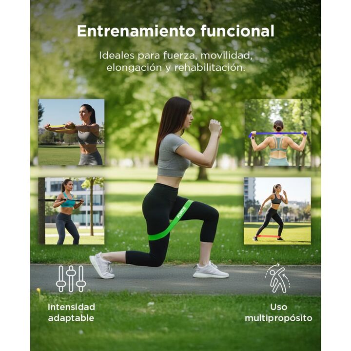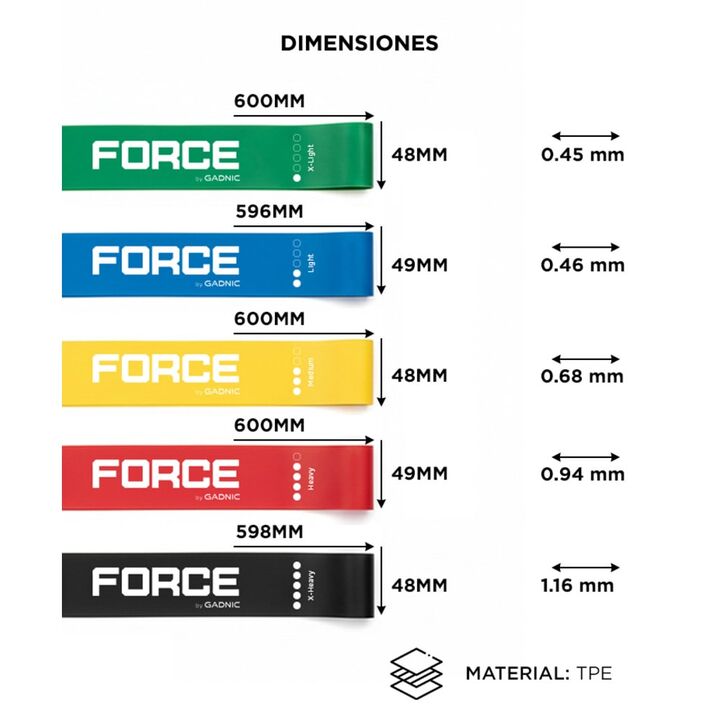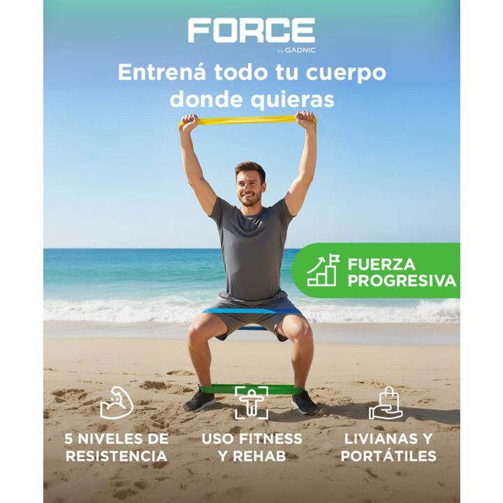 Entrenamiento completo para todo el cuerpo: Las bandas elásticas Force by Gadnic FIT00009 permiten trabajar brazos, piernas, glúteos y core con una sola herramienta. Resultan adecuadas para rutinas de fuerza, movilidad y elongación tanto en casa como en gimnasio. Cinco niveles de resistencia progres...