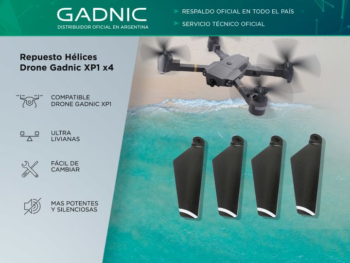 ¡Combo repuestos originales Gadnic, 4 hélices ultra silenciosas! El set incluye dos pares de hélices especialmente diseñadas para tu drone Xp1 Simple Suma potencia y minimiza los ruidos de tu drone con el combo de hélices ultra livianas Especificaciones Compatible: Drone Gadnic XP1 Peso: 0.5gr