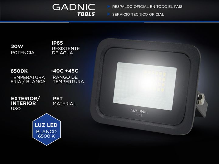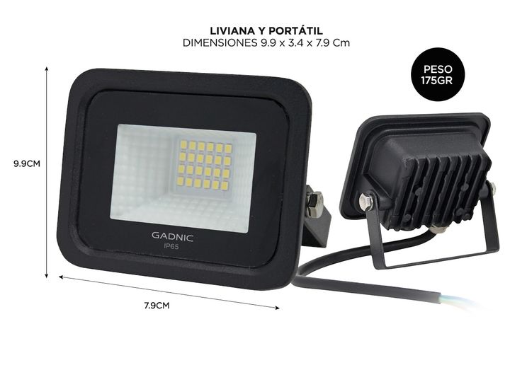 Especificaciones Reflector Led Blanco 20W Exteriores/Interiores - REFL020W Reflector Exterior/Interior A prueba de Agua: Sí IP65 Luz Led Blanco 6500 K Potencia: 20W Color: Negro Corriente: 220 - 240 V Vida Util: 15000 Hs Dimensiones: 9.9 x 3.4 x 7.9 Cm Peso: 175 Gr Material: Pet Rango de Temperatura...