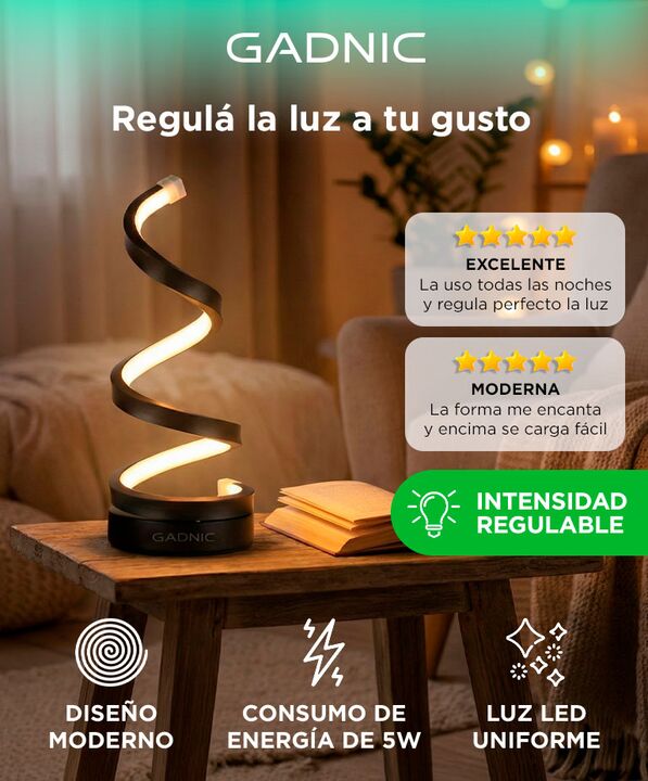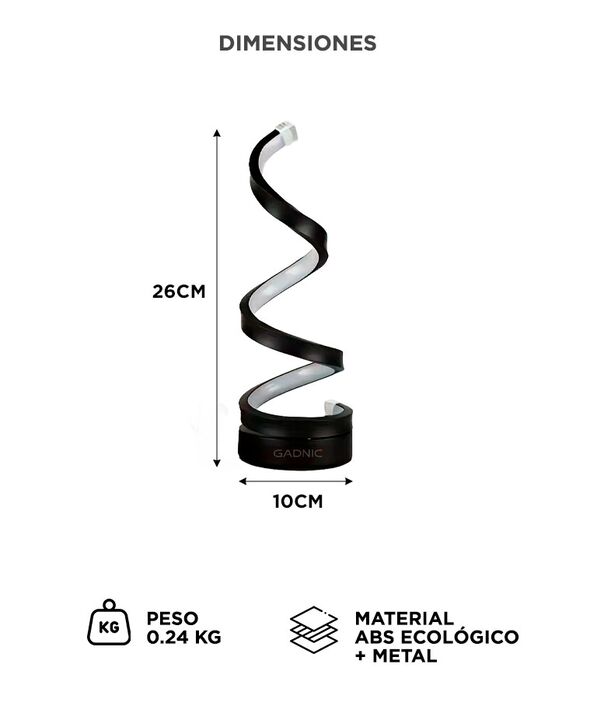 Luz LED cálida y blanca Alterná entre dos tonos según el momento. Ideal para relajarte o trabajar. Diseño moderno espiralado Una lámpara que también decora. Estética elegante y minimalista. Funcionamiento por USB Conectala fácilmente gracias a su funcionamiento con cable USB. Materiales resistentes ...
