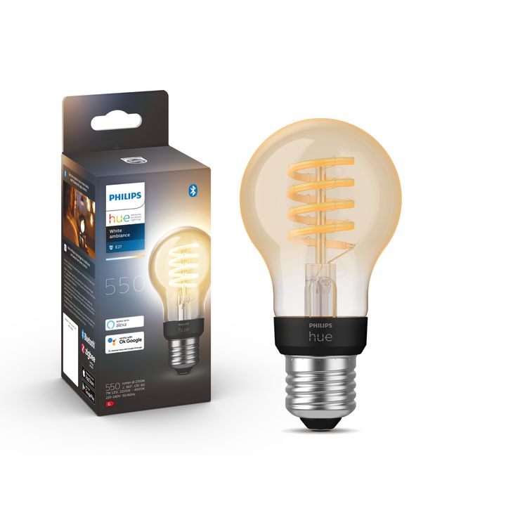 *Pack x2 ampolletas* Lampara Led Inteligente Philips Hue White Ambiance Filament E27 550 lm La bombilla Philips Hue White Ambiance Filament E27 combina el estilo vintage de las lámparas de filamento con la innovación de la iluminación inteligente. Su diseño tipo Edison, con filamento en espiral y vi...