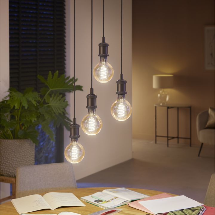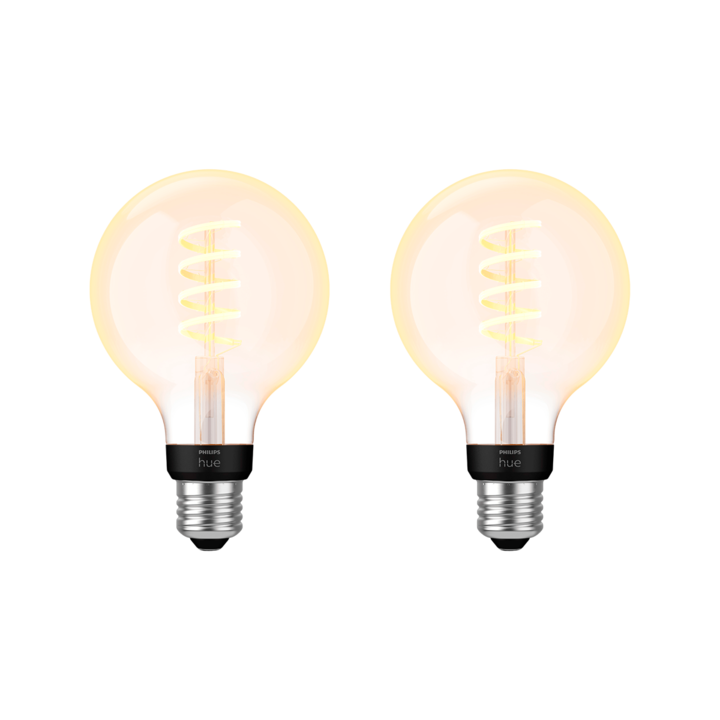 *Pack x2 ampolletas* Lampara Led Inteligente Philips Hue White Ambiance Filament G93 E27 550 lm La bombilla Philips Hue White Ambiance Filament G93 combina un diseño retro con la innovación de la iluminación inteligente. Su estilo tipo globo con filamento en espiral y vidrio transparente la conviert...