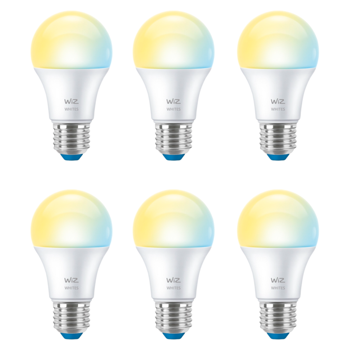 *Pack x6 lamparas* Lampara LED Inteligente WiZ A60 E27 806 lm Luz Blanca Regulable La bombilla inteligente WiZ A60 de 8 W te ofrece la flexibilidad de elegir entre luz blanca cálida y fría para cada momento del día. Con su casquillo estándar E27 y diseño clásico A60, se adapta fácilmente a la mayorí...